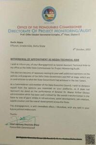 “I wish to inform you, of your disengagement as special assistant technical aide to my office as the Delta state commissioner for project monitoring/audit.