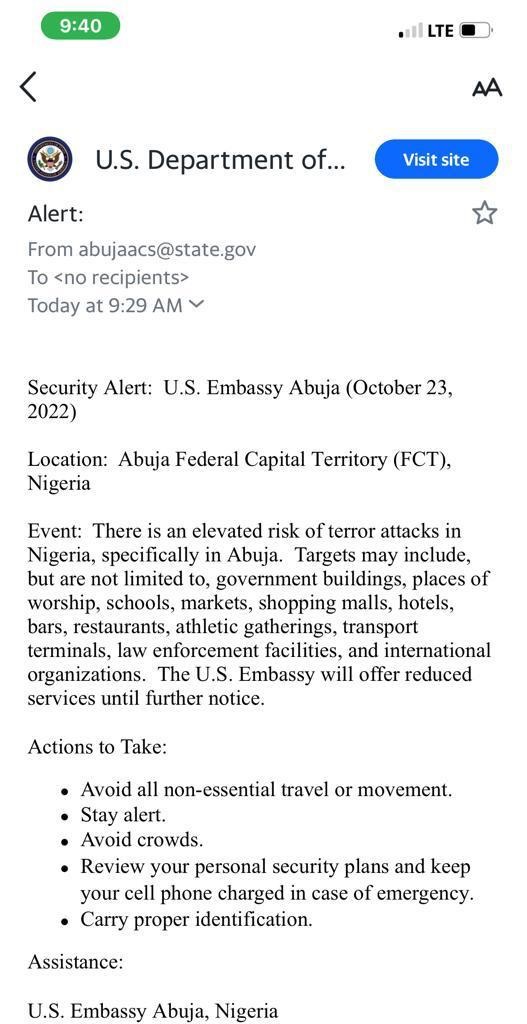 In a statement publish on its official website, the U.S Embassy revealed that there is an elevated risk of terror attacks in Nigeria, specifically in Abuja, adding that it will, henceforth, offer reduced services until further notice.