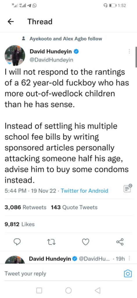 In an apparently now deleted tweed Hundeyin says Femi Fani Kayode has more than 10 out of wedlock children and faces school fees problem and advices him to seek other paying jobs and buy contraceptives to stop further reproduction