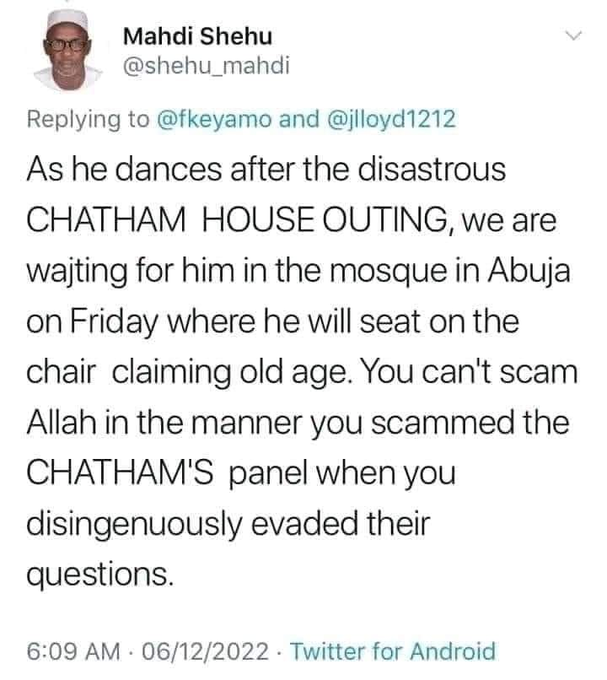 “We in the North, from Adamawa to Zamfara we are still burying our dead and the person who is aspiring to be a leader with his team, they’re there in the beer parlor in London dancing the ‘Buga’.