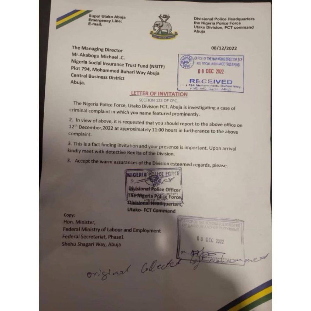 The Nigeria Police Force has summoned the Managing Director of Nigeria Social Insurance Trust Fund (NSITF), Michael Akabogu, over the alleged forgery of the National Youths Service Corps (NYSC) Discharge Certificate attached to his Curriculum Vitae.