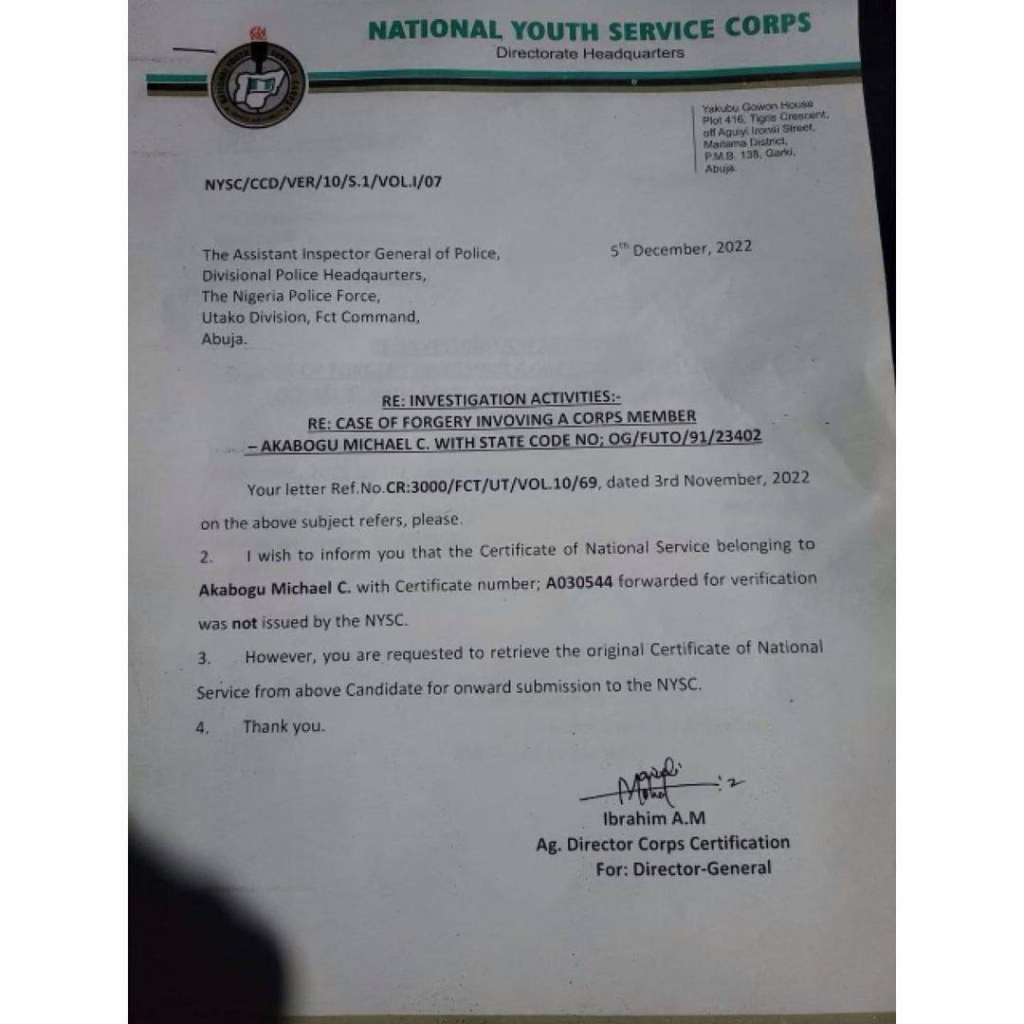 The December 5 letter addressed to the Assistant Inspector-General of Police, Divisional Police Headquarters, Utako Division, FCT Command, Abuja, was signed on behalf of the NYSC Director General by the Acting Director Corps Certification, Ibrahim A.M.