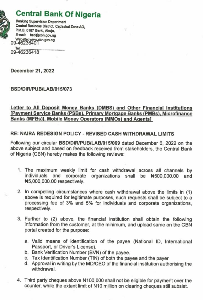 It reads in part: “In compelling circumstances where cash withdrawal above the limits is required for legitimate purposes, such requests shall be subject to a processing fee of three per cent and five per cent for individuals and corporate organisations, respectively.”