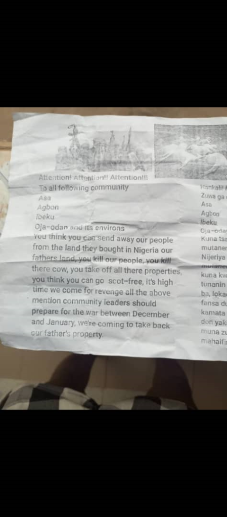 In the letter, written in English and Hausa languages, the herdsmen had said that communities such as Oja-Odan, Ibeku, Asa and Agbon in the area should expect war from them between December and January.