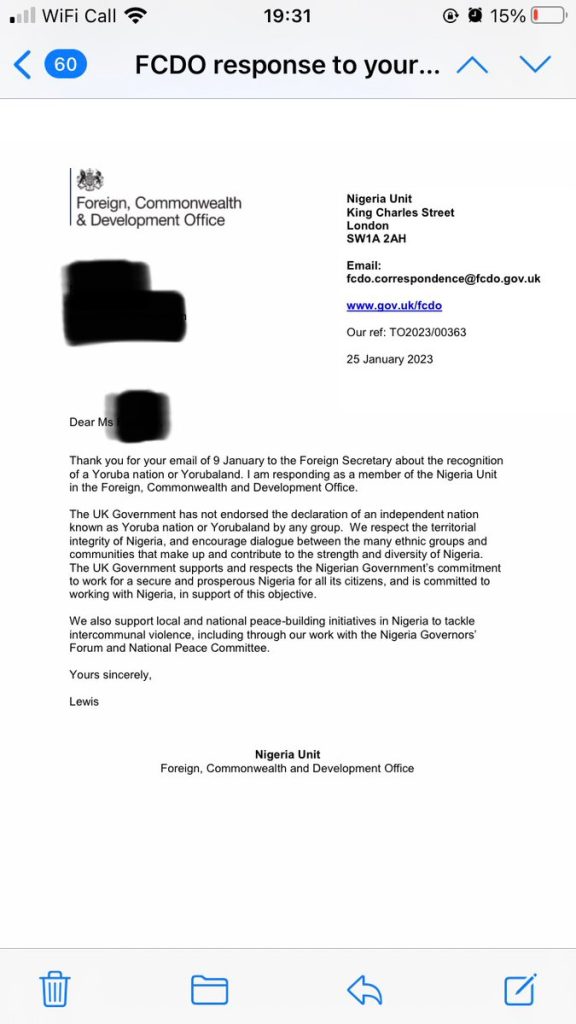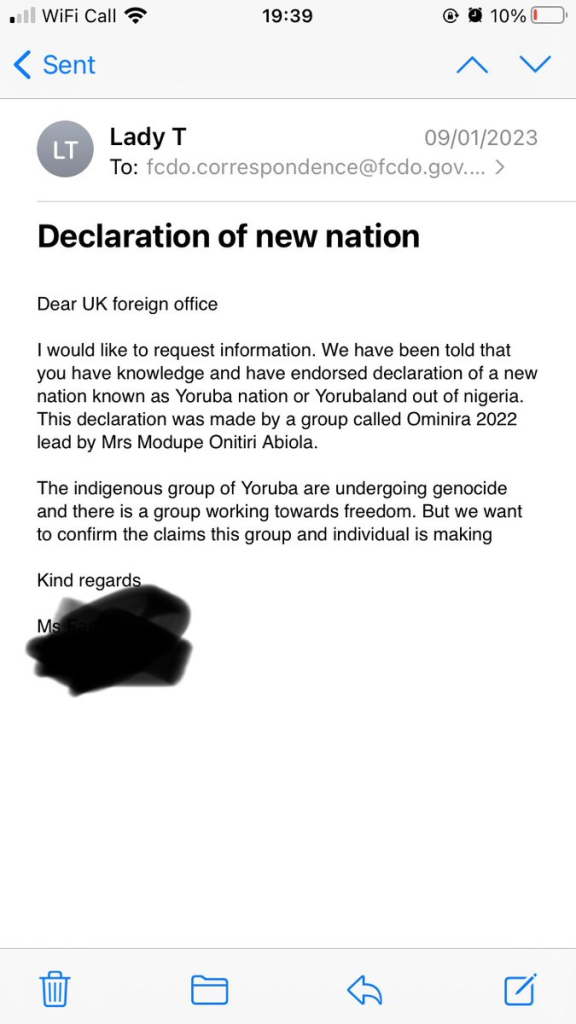 Documents reaching us say that the UK Foreign office has denied declaring the declaration of a Yoruba nation as claimed by a group called Ominira 2022 headed by Mrs Modupe Onitiri Abiola.