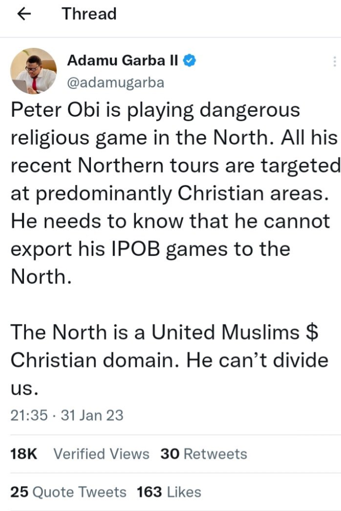 Peter Obi is playing dangerous religious game in the North. All his recent Northern tours are targeted at predominantly Christian areas. He needs to know that he cannot export his IPOB games to the North. The North is a United Muslims $ Christian domain. He can’t divide us.Neither Tinubu nor Shettima nor any APC member targets any Muslim majority areas in states where there are Christians for campaign. We target only conventional areas. Peter Obi is not aspiring to be the President, he’s planning an dangerous agenda beyond politics. Unacceptable!