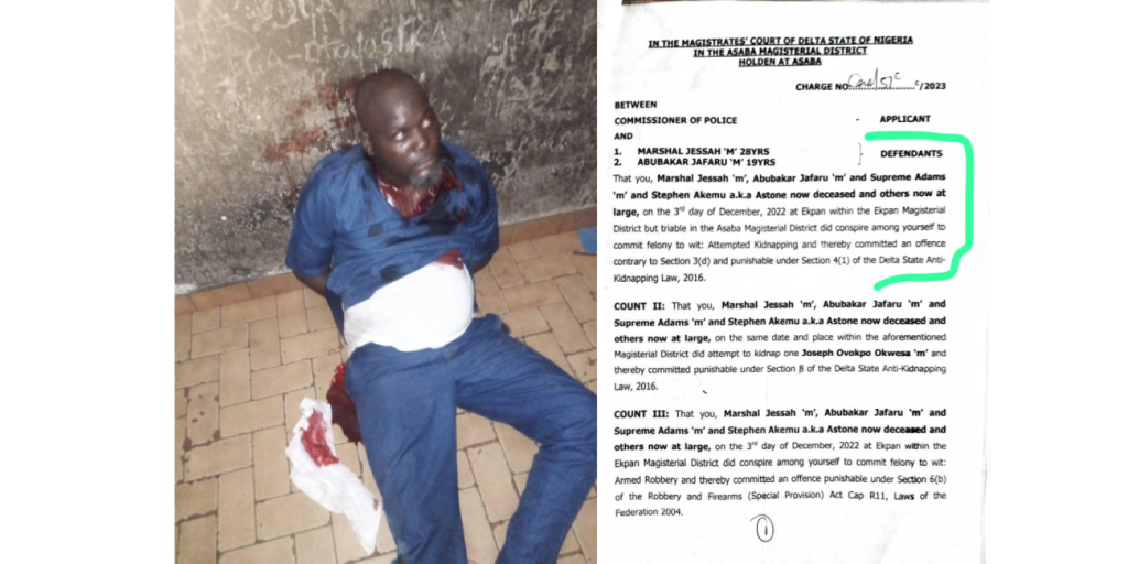 The court document reads, “That you, Marshal Jessah ‘m’, Abubakar Jafaru ‘m’ and Supreme Adams ‘m’ and Stephen Akemu a.k.a Astone now deceased and others now at large, on the 3rd day of December, 2022 at Ekpan within the Ekpan Magisterial District but triable in the Asaba Magisterial District did conspire among yourself to commit felony to wit: Attempted Kidnapping and thereby committed an offence contrary to Section 3(d) and punishable under Section 4(1) of the Delta State Anti- Kidnapping Law, 2016.