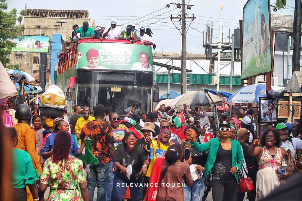 “I hit the road today to contribute my quota for Gbadebo Rhodes-Vivour to get elected as Lagos state Governor, joining his campaign train on a market tour. He really learnt from the best, taking his message to Alaba International & Trade Fair and other markets in Lagos State.”