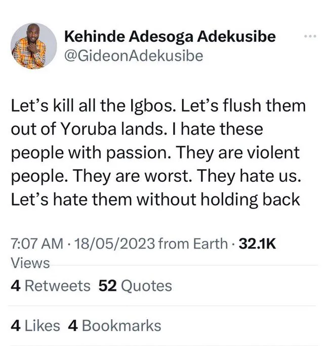 The Osun Police Command has arrested 28-year-old Kehinde Adesogba Adekusibe for allegedly violating the social media policy on hate speech by calling for an insurrection against the Igbo tribe in Nigeria. In a statement issued on Friday by Police PRO, Olamuyiwa Adejobi, it was disclosed that the suspect, Kehinde Adekusibe, on 18th May 2023 via his Twitter handle called for killings of Igbo descent in South West.