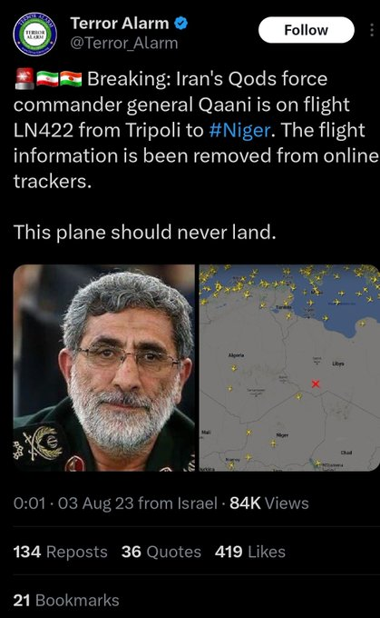 According to the French ambassador to Niger, Iran’s Qods force commander general Qaani was on the flight LN422 from Tripoli to Niger last night. /Regency Reports