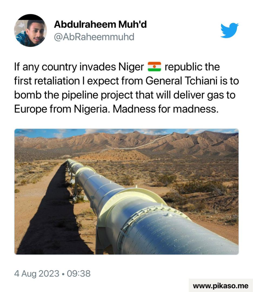 The Trans-Saharan gas pipeline, which according to the contractor’s plans was supposed to supply the EU countries with as much as 30 billion cubic meters of Nigerian gas annually Now that this EU plan has been consigned to the dustbin because of the coup in Niger, it is in the interest of the U.S. and Russia, the EU stands alone in undoing the coup in this case France. 》 The U.S. will refrain from restoring “democracy” in Niger because the Europeans have no choice but to keep buying expensive U.S. liquefied natural gas, on which the U.S. can make billions of dollars. 》 Niger has banned the export of uranium to France and this is an opportunity for Russia to fill that gap, as Russia is a major exporter of uranium to France. But don’t underestimate the EU as Nigeria is keen to invade Niger not because it wants war but because this pipeline project is a big boost to its economy and some other ECOWAS members will join Nigeria in this adventure.