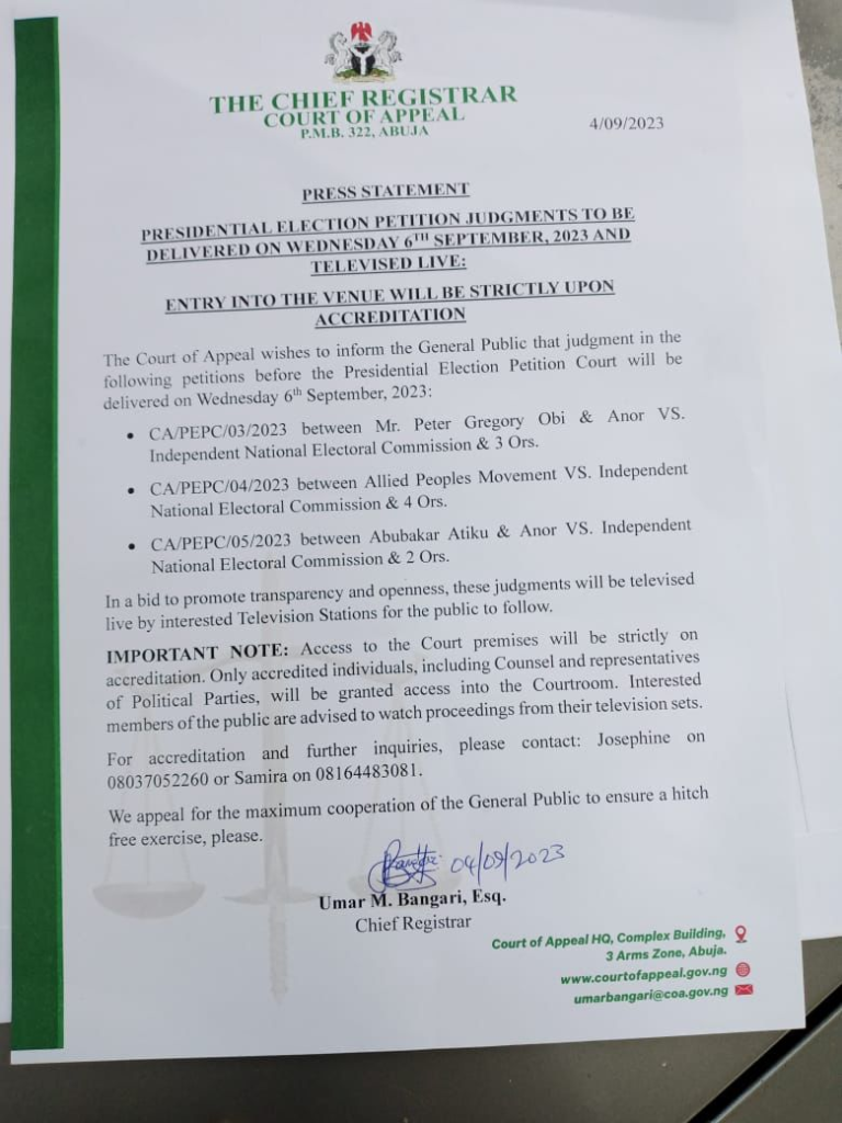 “The Court of Appeal Registrar Umar Bangari confirmed this to Channels Television on Monday, saying the proceedings will be open to live broadcast by interested television stations…while the emilokan government doesn’t want to make public!” News