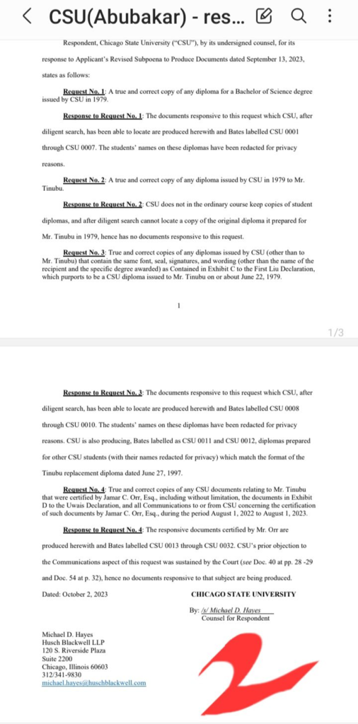 In compliance to the ruling of U.S Judge Nancy Maldonado, Chicago State University has released the academic records of President Bola Tinubu to former vice president Atiku Abubakar.
