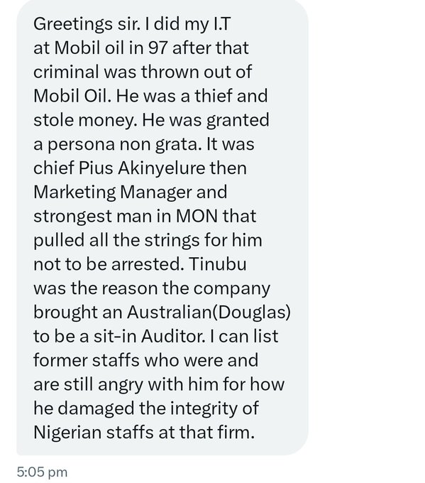 Information on “Tinubu’s” adventures at Mobil Nigeria, which they’d probably deny, now that he’s in power, is seeping out, little by little. This is just one of several messages in my inbox corroborating what my.elderly source told me about the role Pius Akinyelure played in Yekini’s life.