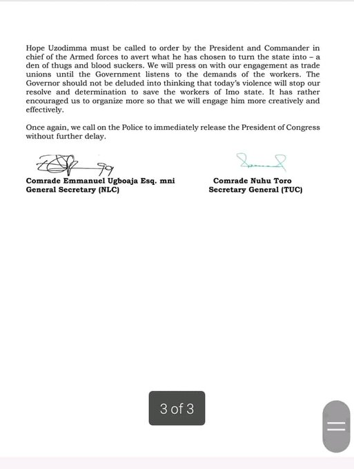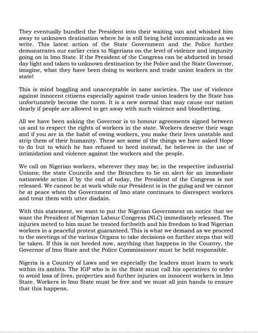 Ajaero, during a press briefing on Sunday, had accused the Imo State Government of “violating the rights of the Nigerian workers in the state.”
