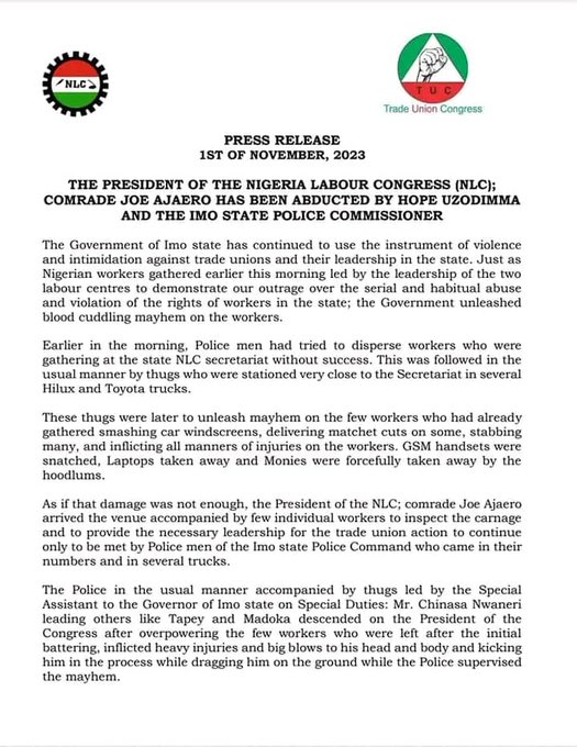 “President of the Nigeria Labour Congress, Comrade Joe Ajaero was picked up a few minutes ago from NLC state council secretariat by heavily armed policemen in Owerri and taken to an unknown destination,” Upah informed our correspondent via a text message.