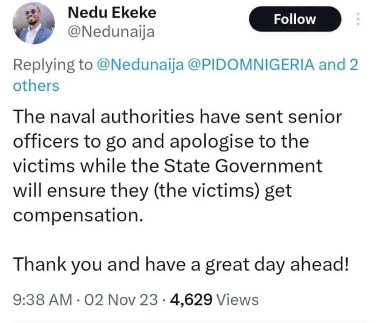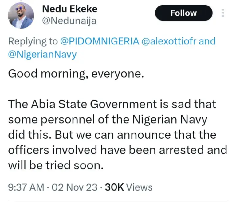 Reacting over the unprofessional acts of the Naval Officers, Deputy Chief of Staff to the Governor, Mr Nedu Ekeke, revealed that the officers have been arrested and will be tried soon. “The Abia State Government is sad that some personnel of the Nigerian Navy did this. But we can announce that the officers involved have been arrested and will be tried soon,” Nedu said