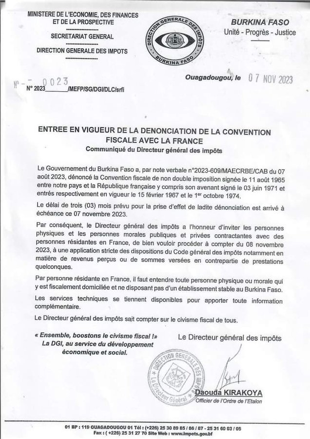 On August 7, 2023, the gov’t of Burkina Faso denounced the non double taxation of the tax treaty signed on August 11, 1965 between our country and the French Republic, including its amendment signed on June 3, 1971 and which entered into force respectively on February 15, 1967 and October 1, 1974. The three (03) month period provided for the aforementioned denunciation to take effect expired on November 7, 2023. Therefore, from November 08th, 2023, all French companies, multinationals and personnel working in Burkina Faso will start paying taxes. Remember, in August, I wrote a post on this, explaining that since 1965, France ensured that all the French citizens and their corporations making money in our country didn’t pay any taxes, but rather remitted taxes on their earnings in Burkina Faso to France. What a rigged system, especially when you know that after independence, we didn’t have not even a single company in France. And yet, France designed such a wicked scheme to suck “our sweat and blood.” France is a scavenger, a predator that only preys on the weak unashamedly. In reality, France is a saprophyte state that does not work and depend on her own like Germany and other European countries, but she feeds on the sweat and blood of Francophone countries. But that Francophone project is now over.