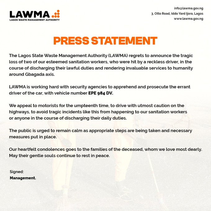 PRESS STATEMENT The Lagos State Waste Management Authority (LAWMA) regrets to announce the tragic death of two of our esteemed sanitation workers, who were hit by a reckless driver, in the cause of discharging their lawful duties