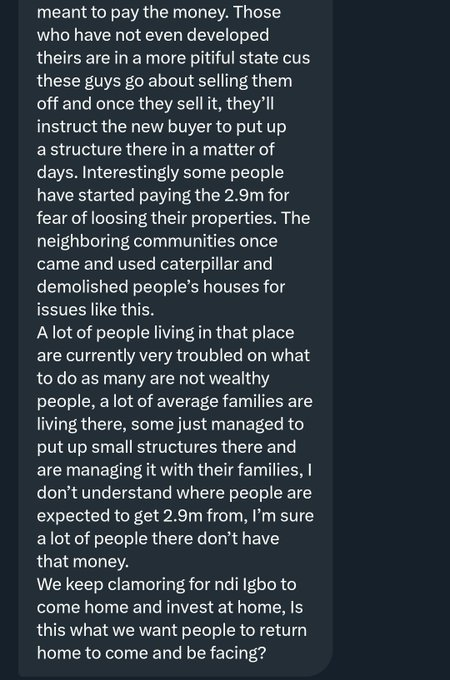 From my dm.. Ndigbo come home, Ndigbo come home, na like this we go come home? To be victims in our own land, in the hands of our own kinsmen? What good has ever come out of Oba? To the general public, avoid investing in Oba until the community sorts out exactly what their problems are. What’s the difference between this and the demolition going on in Lagos?! Why is there no uproar like we saw in Lagos? If it’s done by our people, it’s cool, if it’s Lagos, it’s witch hunting and marginalisation! Why is ANSG quiet? Who are the people behind this wickedness?! Same Oba that collect ID card money from non indigenes? Same Oba that collect new development levy on each decking? Same Oba 12yr old were doing prost!tut!on? Like I said, avoid investing in Oba.