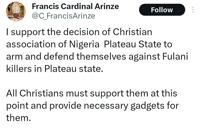 Catholic cardinal Francis Arinze has called upon Christians nationwide to provide necessary gadgets for the christians in plateau to defend themselves against Fulani killers in plateau state.