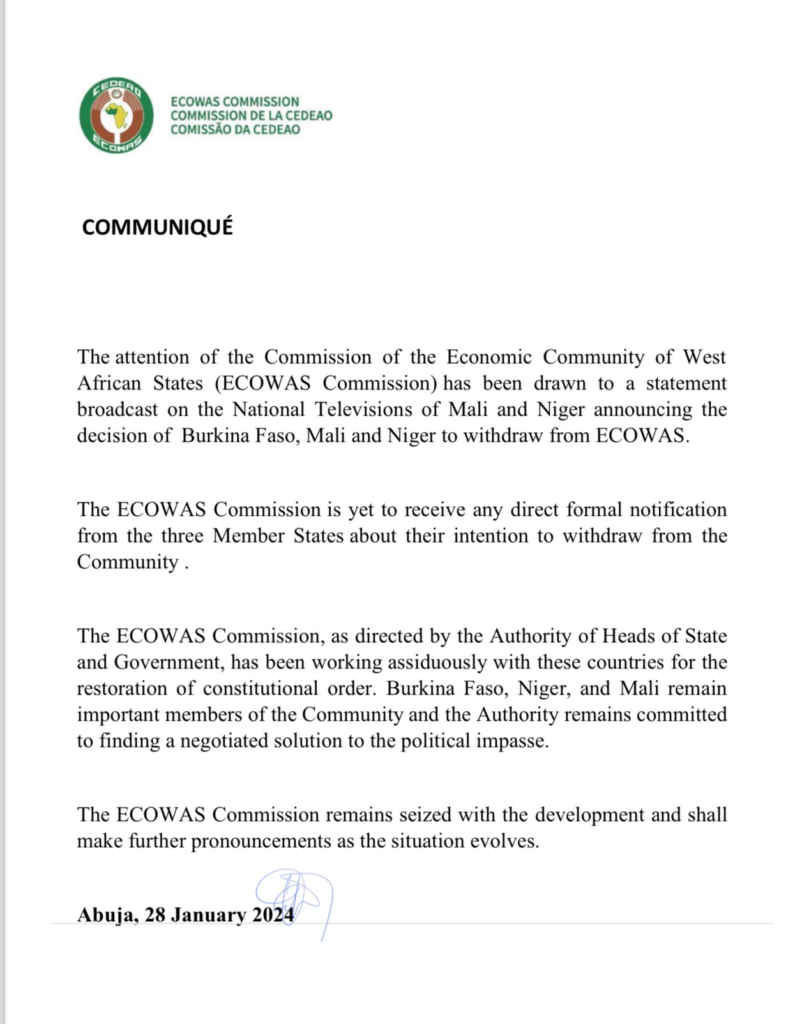 The ECOWAS Commission is aware of reports about Burkina Faso, Mali, and Niger planning to withdraw from ECOWAS but has not received formal notifications; they are focused on restoring constitutional order and finding a negotiated solution.a communique from Ecowas reads