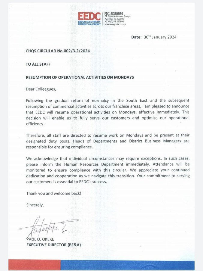 Our attention has been drawn to this letter being circulated by the enablers. We are warning EEDC to desist from writing public notice that will trigger violence in Biafra states. Old Enugu state remain a Biafra state and the Government of Biafra has not called off the sit at home. The sit at home continues every Monday and another sit at home for the self referendum will be announced today during State of the Union address.