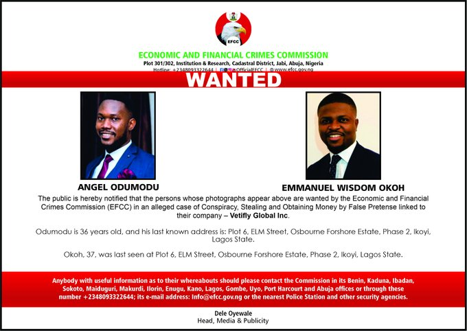 WANTED BY EFCC: ANGEL ODUMODU and EMMANUEL WISDOM OKOH
