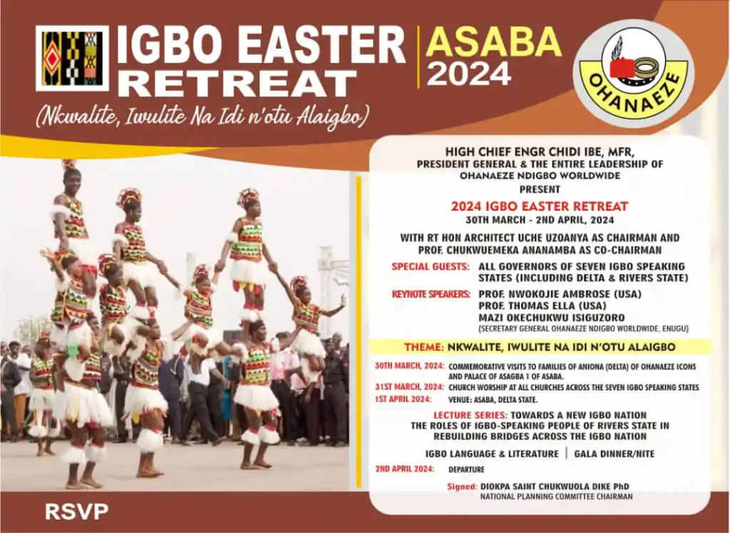 Amidst the myriad economic challenges and escalating insecurity threatening Igbo-speaking states, the 2024 IGBO EASTER RETREAT, themed ‘NWALITE, IWULITE NA IDI NOTU ALAIGBO’ (Towards Building a New Igbo Nation), stands poised to unfold in Asaba, Delta State from March 30 to April 2, 2024. A statement by the Chairman, 2024 IGBO EASTER RETREAT National Planning Committee, DR (Diokpa) Saint Chukwuola Dike, said the landmark gathering seeks to chart a new course for a revitalized Igbo identity, marking a pivotal moment in our collective history. According to the statement, “The core objective of this gathering is to forge immediate solutions towards the establishment of a ‘NEW IGBO NATION’, crafted through a synergy of enlightenment initiatives and the united efforts of all Igbo individuals, both within our homeland and across the diaspora. “Central to our focus are themes of industrialization, resource development, the innovative ‘IGBO LIGHTS PROJECTS’, and the resounding call to action for ‘THINK HOME INVESTMENTS’ campaigns.