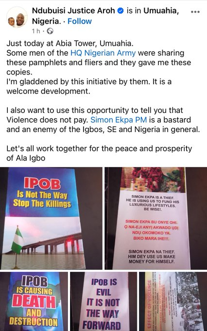 ge claims members of te Nigerian army in Umahoa Aboa state handed him flyers asking residents to disassociate themselves from IPOB