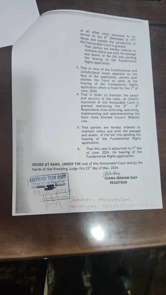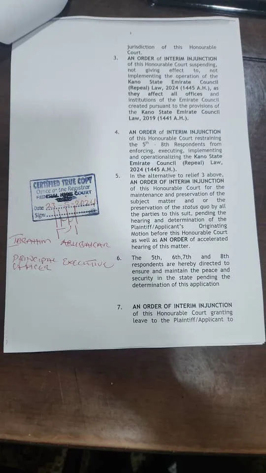 “AN ORDER of INTERIM INJUNCTION of this Honourable Court suspending, not giving effect to, not Implementing the operation of the Kano State Emirate Council (Repeal) Law, 2024 (1445 A.H.), as they affect all offices and institutions of the Emirate Council created pursuant to the provisions of the Kano State Emirate Council Law, 2019 (1441 Α.Η.),” among other prayers.