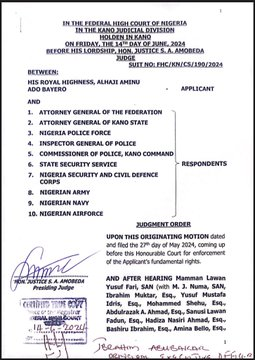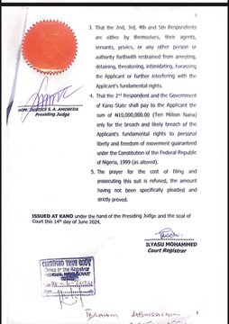 HRH Aminu Ado Bayero has won this case against the Kano state government as the Court directed the state government to pay the sum of N10M to Alhaji Aminu Ado Bayero for the breach of his fundamental rights and personal liberty and freedom of movement, following the Kano State Governor’s directives to arrest him without any lawful justification. via Abdul Aziz na Ibi Abubakar on X