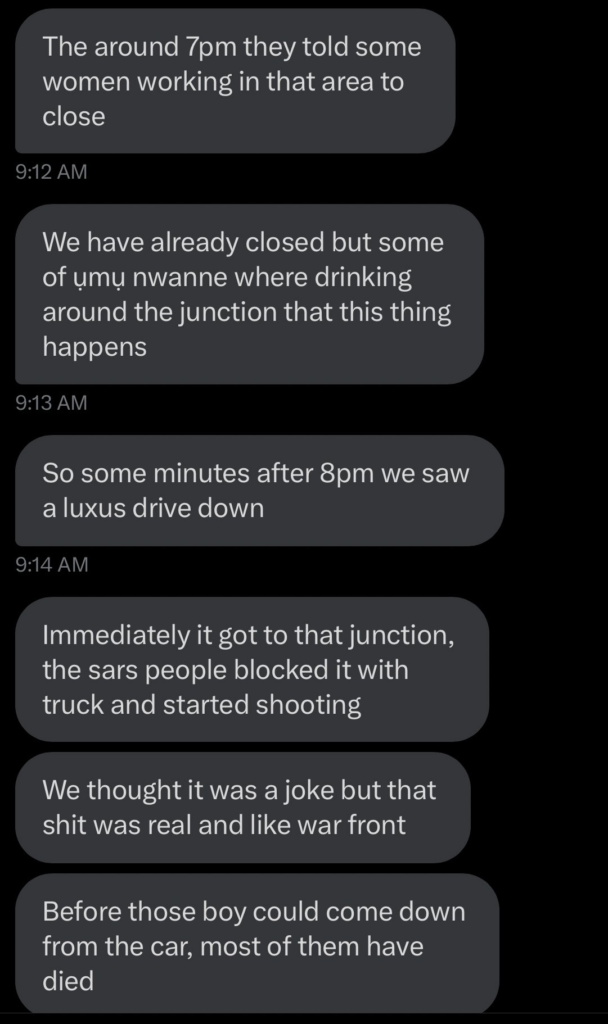 According to this version..some people asked those selling in the ladipo area to close by 7pm…an hour later a lexus SUV drone down and the police opened fire killing every one ..none could even come down