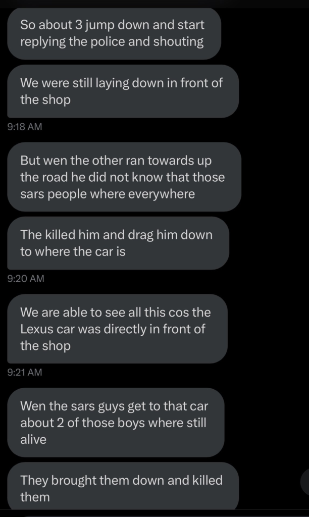 Three managed to jump down and started shouting…two were still in the car when the police approached the SUV..police dragged them down and shot them in cold blood
