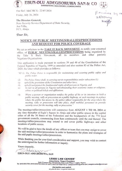 Dear Sir, NOTICE OF PUBLIC MEETINGS/RALLIES/PROCESSIONS AND REQUEST FOR POLICE COVERAGE We act as solicitors to the TAKE IT BACK MOVEMENT, to notify your esteemed office, of PUBLIC MEETINGS/RALLIES/PROCESSIONS being organized by the Take It Back Movement, all its members and other patriotic Nigerians/Organisations. This application is made pursuant to sections 39 and 40 of the Constitution of the Federal Republic of Nigeria, 1999 as amended and also section 83 of the Police Act, 2020, the latter which provides as follows: “83 (1)​ The Police Force is responsible for maintaining and securing public safety and public order. (2) The Police Force shall, in carrying out its responsibilities under subsection (1): (a) uphold the provisions of the Constitution and other laws; (b) uphold and protect the fundamental rights of all persons in Nigeria, and (c)​be fair to all persons in Nigeria notwithstanding their economic status or religious, ethnic or political beliefs and affiliations. (4)​Where a person or organization notifies the police of his or its intention to hold a public meeting, rally or procession on a public highway, or such meetings in a place where the public has access to, the police officer responsible for the area where the meeting, rally or procession will take place, shall mobilize personnel to provide security cover for the meeting, rally or procession.” The meetings/rallies/processions will commence from AUGUST 1 TO 10, 2024 or any time thereafter at Eagle’s Square in Abuja and other public spaces in the capital cities of all the 36 States of the Federation and the headquarters of the 774 local government councils, commencing from 8am continuously until the end thereof. The meetings/rallies/processions may extend to and cover public highways and other locations of public access. We will be glad to have the details of any police officer or police team that you may assign to cover the said meetings/rallies/processions in order to harmonize the plans and strategies of the said puplic meetings/rallies/processions. While thanking you for your kind consideration and support, you may wish to contact the undersigned for further information or inquiry.