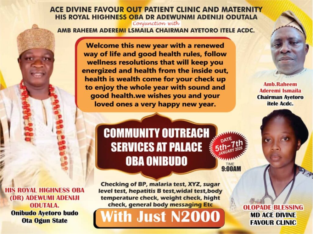 Pls be informed that HRH OBA {DR} ADEWUNMI ADENIJI ODUTALA {Onibudo of Aiyetoro- Budo} & Ace Devine Clinic in Conjunction with AMB. RAHEEM A. ISMAIL { Chairman, Aiyetoro Itele Awori ACDC} has been scheduled Community Health Outreach services🩺💊⚕️ as follows: