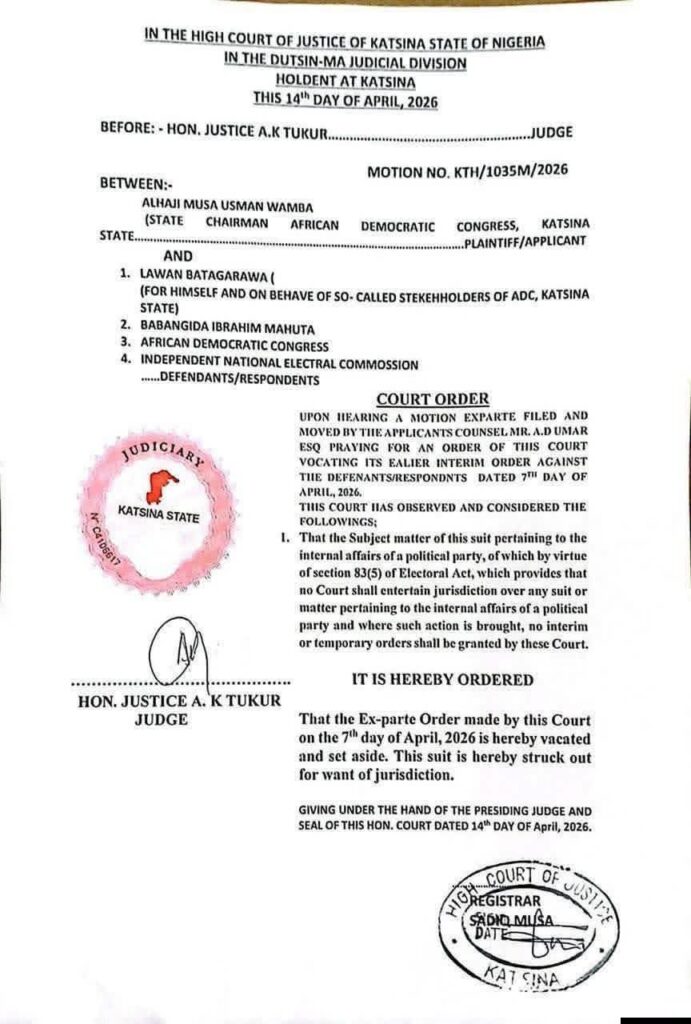 Court Dismisses suit against David led ADC Exco, Labels It’Internal Issues’, Says Party Should Handle It